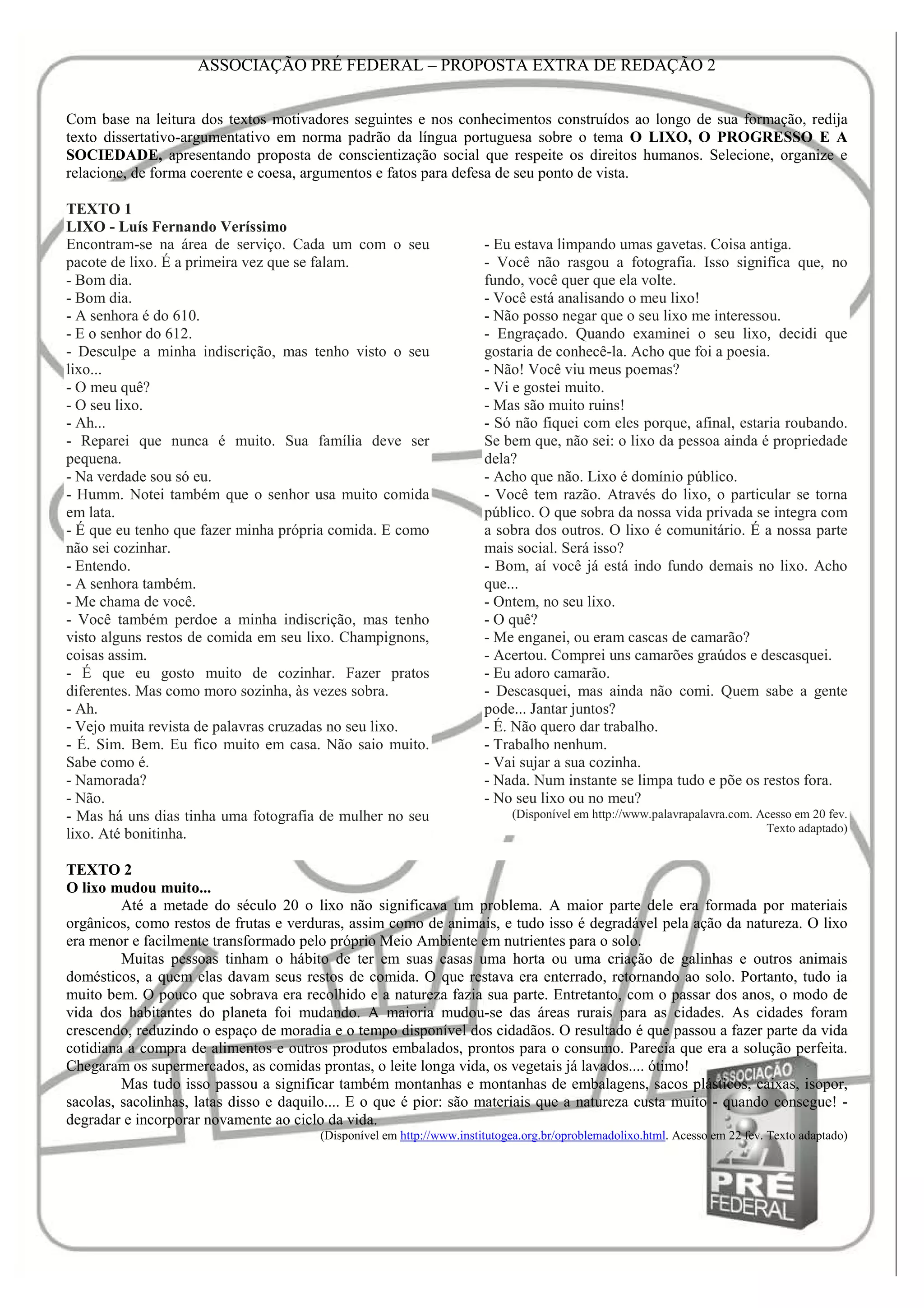 O documento propõe que o estudante escreva um texto dissertativo-argumentativo sobre o tema "O Lixo, o Progresso e a Sociedade", apresentando uma proposta de conscientização social que respeite os direitos humanos. Apoia-se em quatro textos motivadores que abordam: 1) Uma história sobre duas pessoas que se conhecem através da análise do lixo um do outro; 2) Como o lixo mudou com a industrialização e urbanização; 3) Deixa em branco; 4) Decreto sobre separação de resíduos recicláveis
