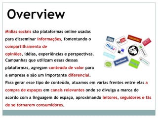 Mídias sociais são plataformas online usadas para disseminar informações e compartilhar opiniões. Publieditoriais agregam conteúdo de valor para empresas nessas plataformas de forma a aproximar leitores de produtos e serviços. A agência oferece serviços como seleção de canais, gestão de publieditoriais e relatórios de resultados.