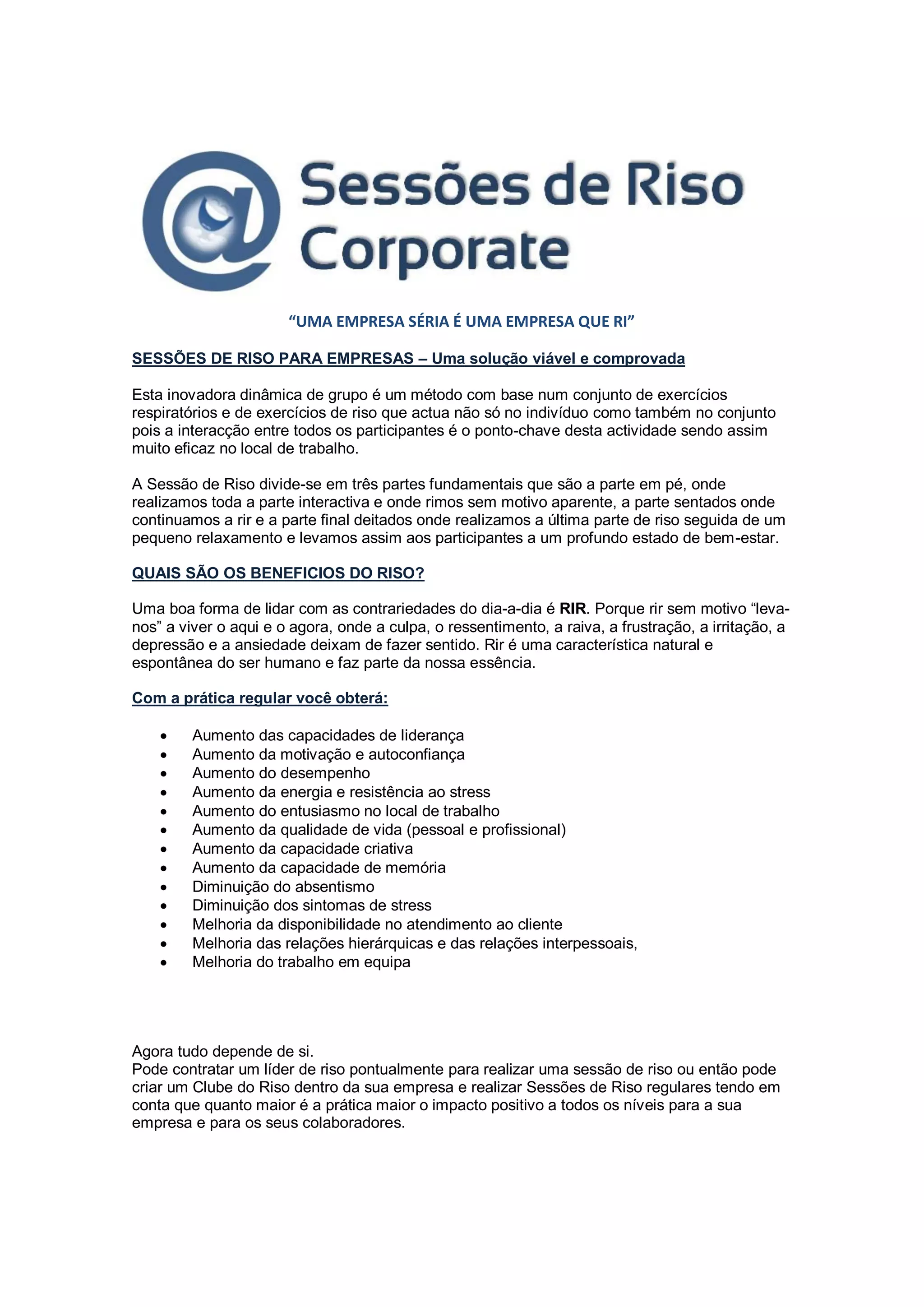 Este documento descreve sessões de riso para empresas como uma solução comprovada para melhorar o bem-estar e desempenho dos funcionários. As sessões envolvem exercícios respiratórios e de riso em grupo que levam a um estado profundo de bem-estar. Os benefícios incluem aumento da motivação, desempenho, criatividade e relacionamentos, além de diminuição de stress e absentismo. Empresas podem contratar um líder de riso ou criar um clube interno de riso para sessões regulares.