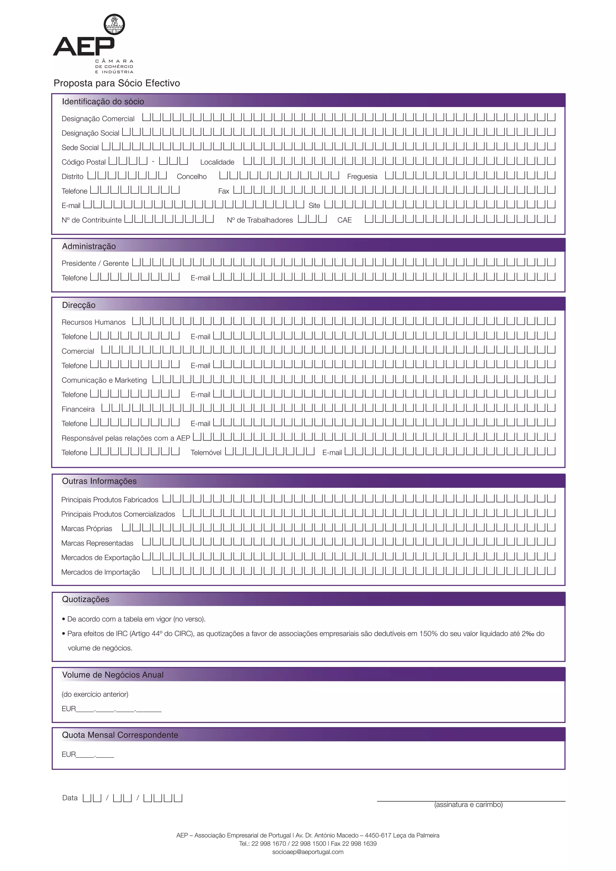 Este documento é uma proposta para se tornar sócio efetivo de uma associação empresarial. Ele fornece detalhes sobre a empresa como nome, endereço, número de funcionários e áreas de negócios. Também lista os contatos de gerência e especifica a cota mensal correspondente com base no volume de negócios anual da empresa.
