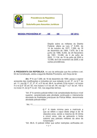 Este documento propõe alterações à legislação sobre militares do Distrito Federal em três áreas principais: 1) define a carreira policial-militar como de nível superior e atividade contínua; 2) estabelece regras sobre readaptação funcional de militares com restrições de saúde; 3) amplia direitos como auxílios e gratificações para militares ativos e inativos.
