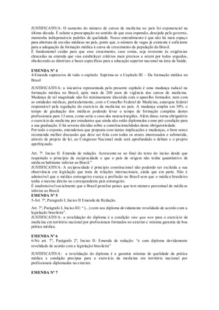As entidades médicas elaboraram 21 emendas à MP do Programa Mais Médicos para o Brasil. As principais emendas visam: 1) definir que os gestores locais do SUS "deverão oferecer" estrutura para ensino, e não apenas "comprometer-se"; 2) retirar trecho que isentava pedidos de cursos de medicina de novas regras; 3) incluir critérios de qualidade para cursos de medicina. Outras emendas buscam garantir direitos trabalhistas para médicos participantes e exigir revalidação de diplomas de estrangeiros