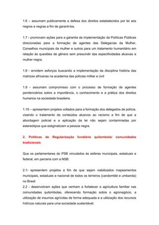 O documento propõe eixos temáticos para políticas públicas do PSB relacionadas a: 1) segurança pública e direitos humanos; 2) regularização fundiária quilombola e comunidades tradicionais; 3) geração de emprego e renda para a população negra; 4) saúde da população negra; 5) educação e cultura. Os parlamentares do PSB são incentivados a apresentarem projetos e defenderem estas causas nas esferas municipal, estadual e federal.