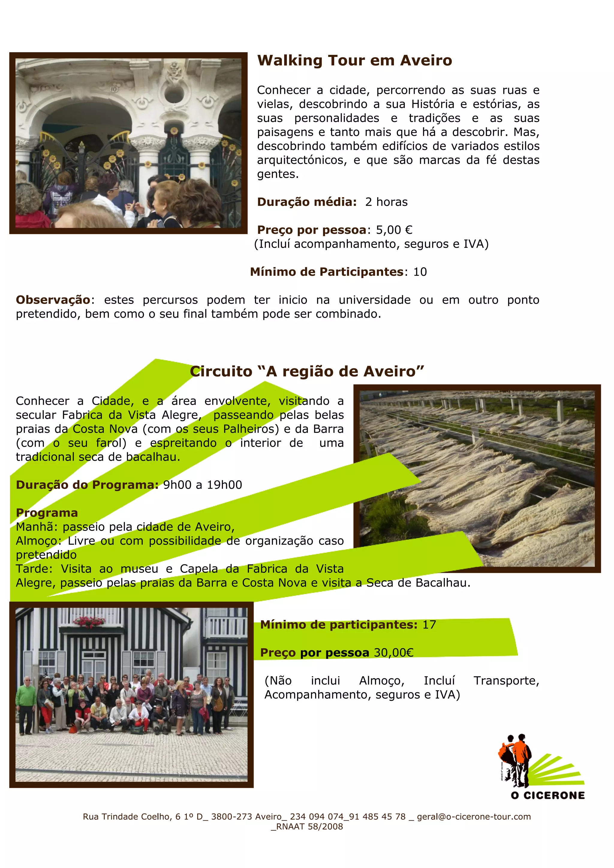 Este documento descreve dois passeios turísticos em Aveiro, Portugal: um passeio a pé de 2 horas pela cidade por €5 por pessoa, e um circuito de 9 horas visitando a fábrica Vista Alegre, praias e uma seca de bacalhau por €30 por pessoa, excluindo almoço. Os passeios incluem guia, seguros e IVA, e requerem no mínimo 10 e 17 participantes respectivamente.