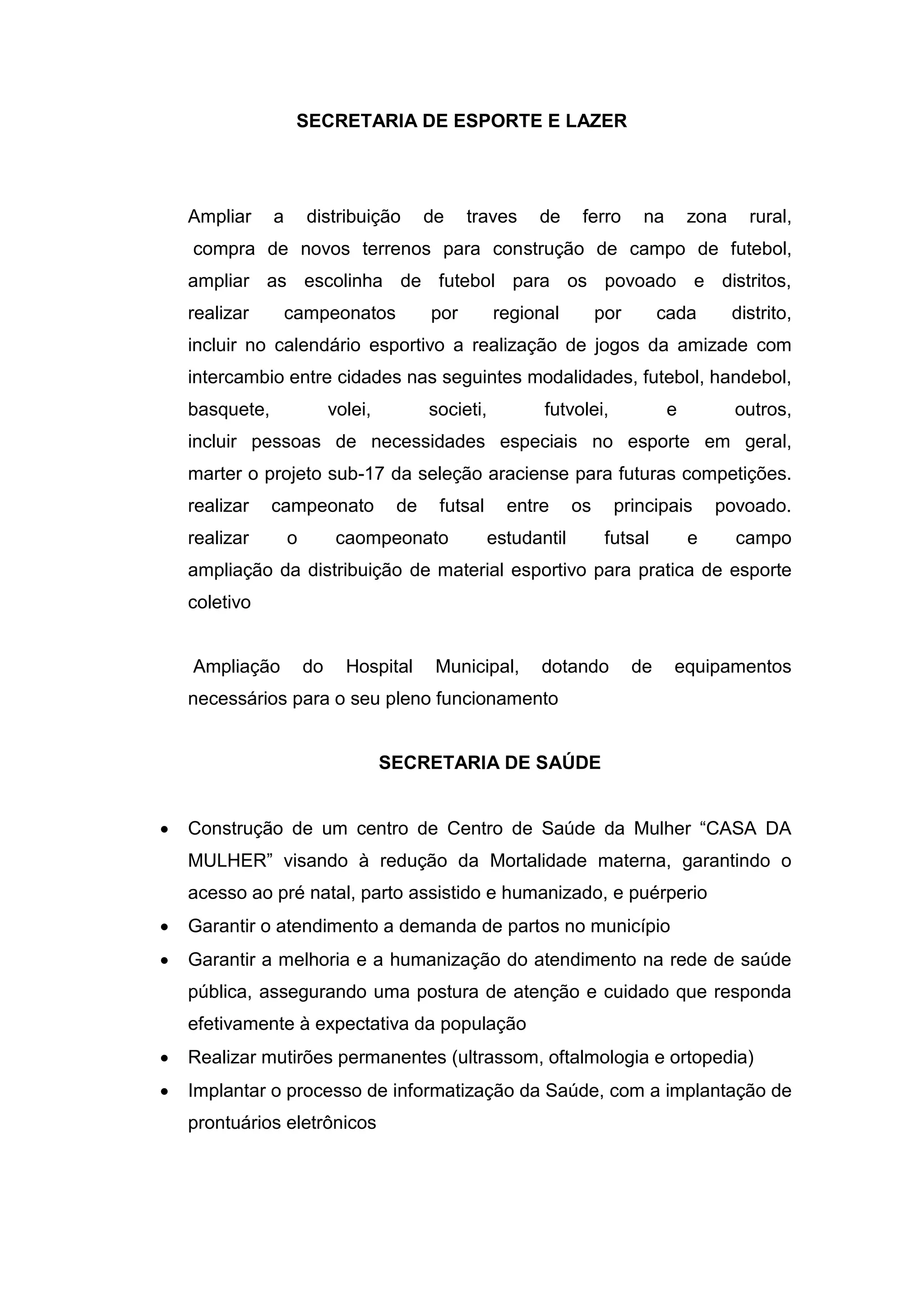 O documento apresenta um conjunto de propostas das secretarias municipais visando melhorias em diversas áreas, incluindo esporte, saúde, educação, infraestrutura e segurança. As iniciativas abrangem desde a ampliação de serviços de saúde e esportes, até a construção de centros administrativos e a criação de programas de qualificação profissional. O objetivo central é promover o desenvolvimento socioeconômico, garantir acesso a serviços básicos e fortalecer a participação cidadã nas decisões administrativas.