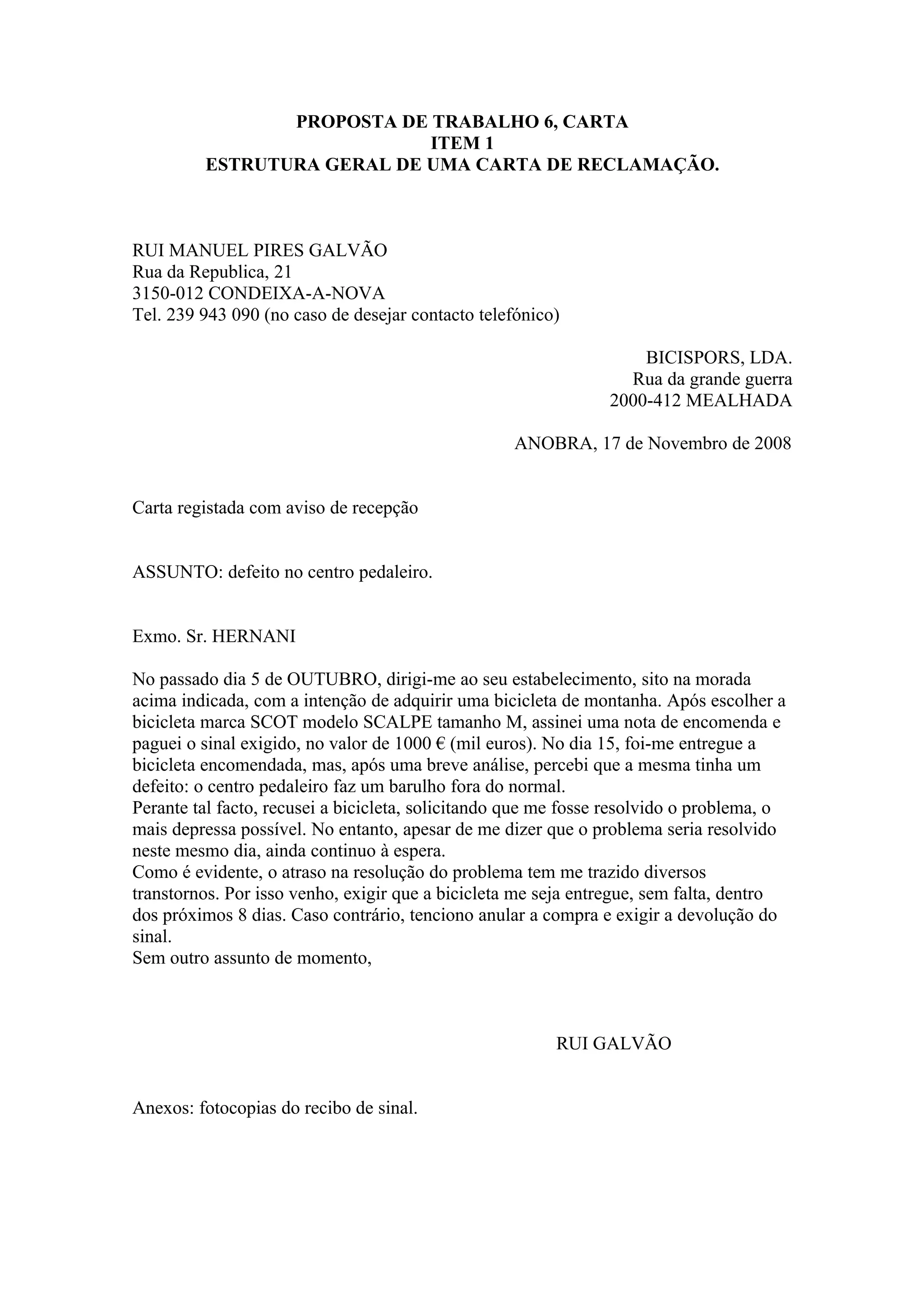 O documento descreve uma carta de reclamação enviada por Rui Galvão à loja Bicispors sobre um defeito em uma bicicleta recentemente comprada. A carta explica que a bicicleta apresentou um barulho anormal no centro pedaleiro na entrega e que a loja prometeu consertar, mas ainda não o fez. Rui exige que a bicicleta seja consertada nos próximos 8 dias ou ele anulará a compra e exigirá o dinheiro de volta.