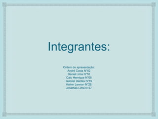 O grupo 07 é composto por 6 integrantes que se apresentarão em ordem: André Costa na posição 02, Daniel Lima na 10, Caio Henrique na 08, Gabriel Dantas na 19, Kelvin Lennon na 28 e Jonathas Lima na 27.