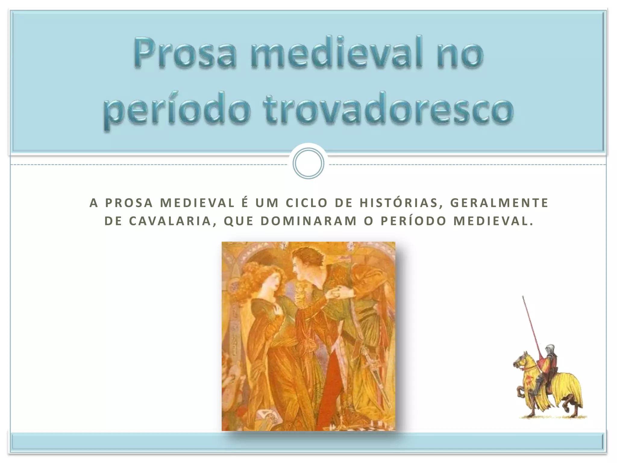 O documento descreve a prosa medieval portuguesa no período trovadoresco, caracterizado por obras de caráter religioso, didático e histórico, como hagiografias, fábulas e crônicas. Destaca-se também o surgimento das primeiras novelas de cavalaria, influenciadas pelos poemas épicos franceses sobre reis e heróis.