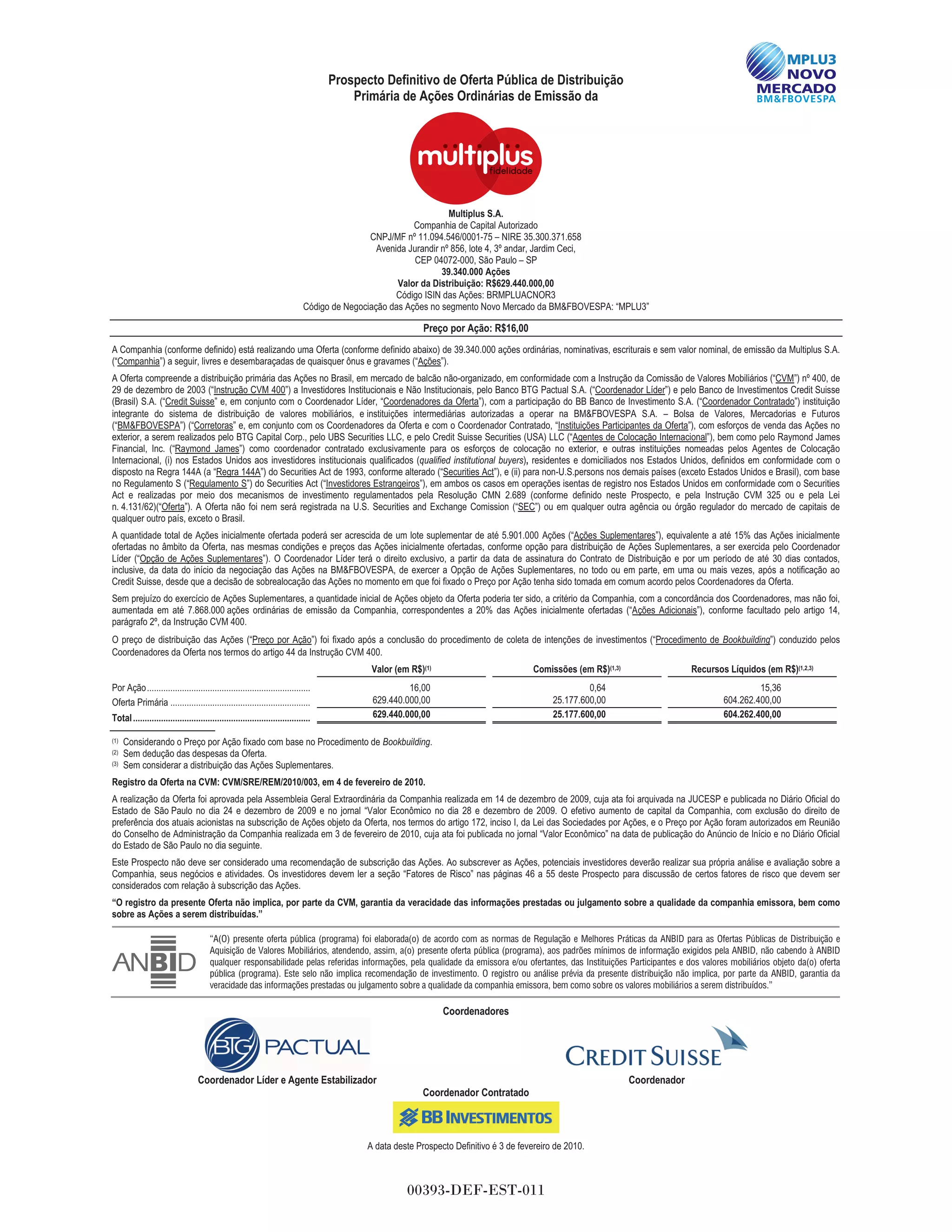 1. A Companhia está realizando uma oferta pública inicial de ações de 39,3 milhões de ações a R$16 cada, totalizando R$629,4 milhões.