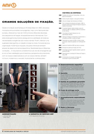 O documento descreve a tecnologia de fixação a vácuo da empresa AMF, incluindo: (1) Uma breve história da empresa desde sua fundação em 1890; (2) Os princípios e vantagens da tecnologia de fixação a vácuo; (3) O modelo de placa de fixação a vácuo da AMF.