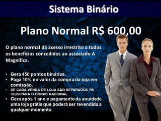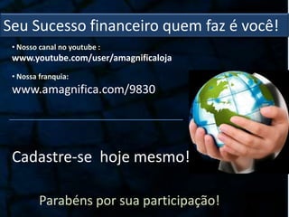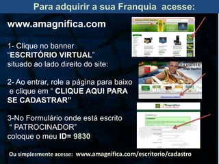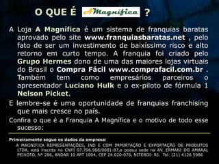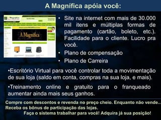 A loja A Magnífica é uma franquia de baixo custo com baixo risco e alto retorno, associada ao grupo Hermes e celebridades como Luciano Hulk. A franquia oferece uma ampla gama de produtos e diversas oportunidades de receita, incluindo vendas diretas e comissões por recrutamento. A plataforma proporciona suporte aos franqueados, incluindo um escritório virtual e treinamento online, facilitando a operação do negócio.