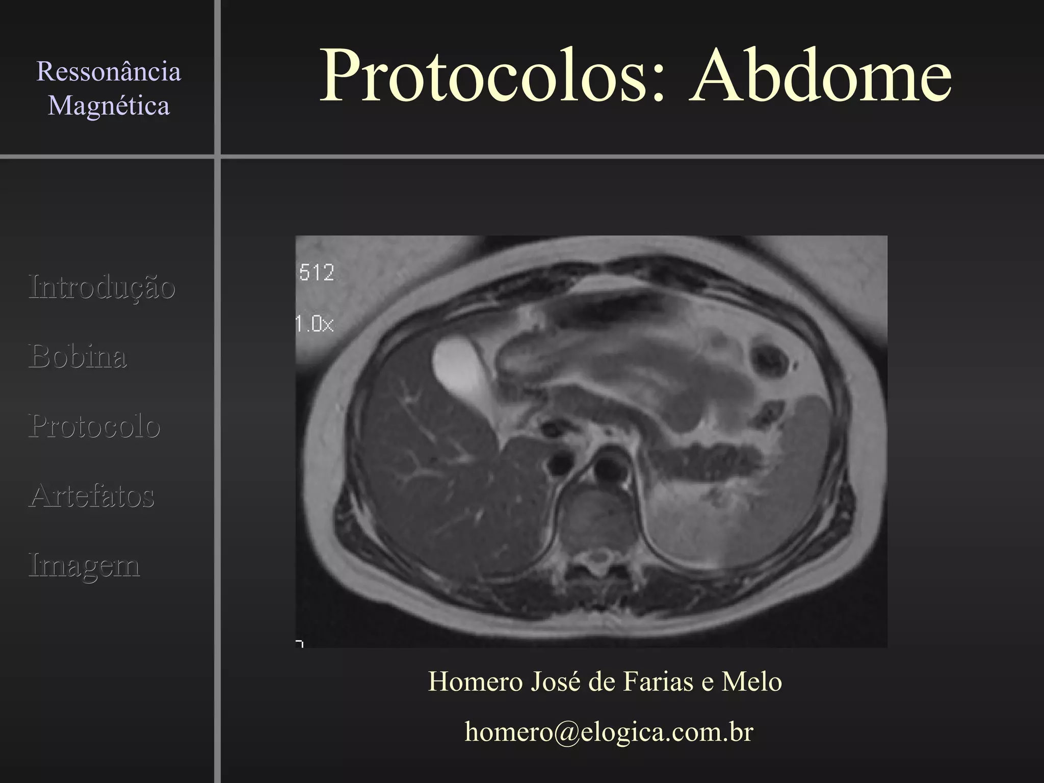 O documento discute protocolos de imagem por ressonância magnética (RM) para avaliação do abdome, incluindo principais patologias do fígado, pâncreas, via biliar, baço, glândula adrenal e rins. Ele descreve o posicionamento do paciente, bobinas usadas, sequências de imagem e reconstrução para exames de RM arterial e colangio-RM.