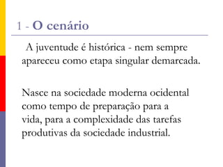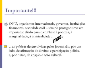 O documento discute o conceito de protagonismo juvenil, que envolve considerar os jovens como atores sociais com direitos e capacidade de participar e decidir sobre seu futuro. O protagonismo juvenil promove a educação para valores através da participação social e coletiva dos jovens, desenvolvendo suas competências para transformar criticamente a realidade.