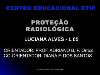 1) O documento discute a proteção radiológica no Centro Educacional ETIP, com foco nos efeitos da radiação nas células e nos métodos para proteger pacientes, profissionais e o local de trabalho.