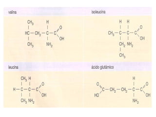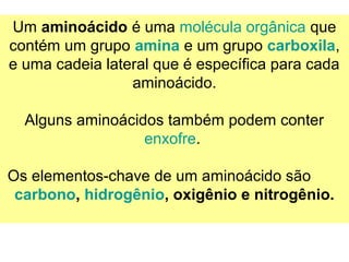 Proteínas são macromoléculas constituídas de aminoácidos. Aminoácidos contêm um grupo amino e um grupo carboxila, e são classificados em naturais ou essenciais. Proteínas desempenham funções estruturais, hormonais, nutritivas, de defesa e enzimáticas no organismo.