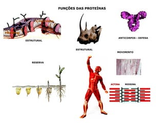 O documento descreve as funções e estruturas das proteínas e aminoácidos. Explica que as proteínas têm funções estruturais, de movimento, reserva e defesa no corpo. Detalha que as proteínas são formadas por cadeias de aminoácidos unidos por ligações peptídicas, e que possuem estruturas primária, secundária, terciária e quaternária. Também define enzimas como biocatalisadoras que aceleram reações químicas no corpo usando alta especificidade de substrato como uma