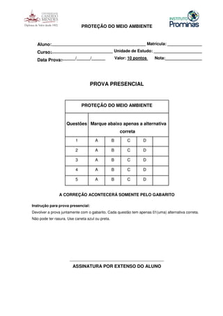 Este documento é uma prova sobre proteção do meio ambiente composta por 5 questões de múltipla escolha. A prova cobre tópicos como os diferentes tipos de meio ambiente, poluição, Relatório de Impacto Ambiental e sistemas de esgoto.