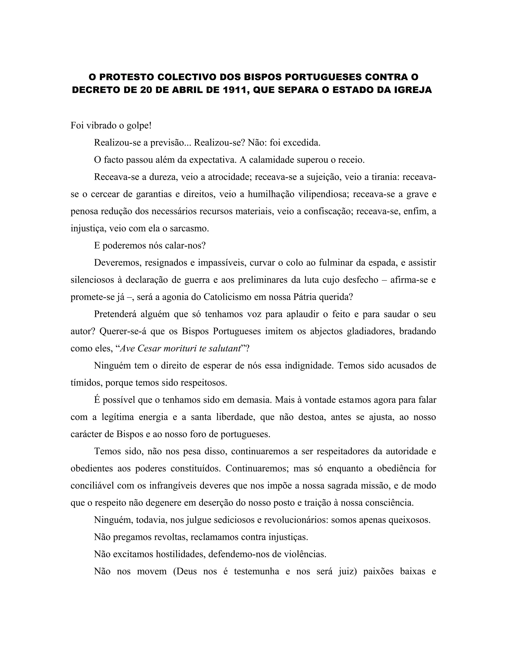 1) O documento é um protesto coletivo dos bispos portugueses contra o decreto de 20 de abril de 1911 que separa a Igreja do Estado. 2) O decreto é descrito como injusto, opressivo, espoliativo e ludibrioso, violando vários princípios legais e direitos. 3) Os bispos alegam que a separação não reflete a vontade da maioria católica portuguesa e carece de legitimidade.