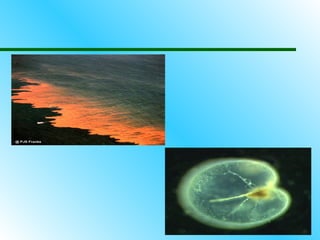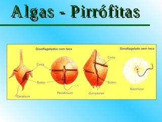 O documento descreve os principais grupos de protozoários e algas, incluindo suas características, exemplos e importância. Os protozoários são classificados de acordo com sua estrutura locomotora e incluem sarcodíneos, flagelados, ciliados e esporozoários. Algas são divididas em verdes, vermelhas e pardas, sendo importantes fontes de alimentos e produtos industriais como agar-agar.