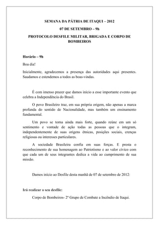 O documento descreve o protocolo para o desfile militar e do Corpo de Bombeiros que ocorrerá em 7 de setembro de 2012 como parte da Semana da Pátria em Itaqui. O desfile incluirá apresentações do Corpo de Bombeiros, 1o Regimento de Cavalaria Mecanizado Sá Brito e da Brigada Militar.