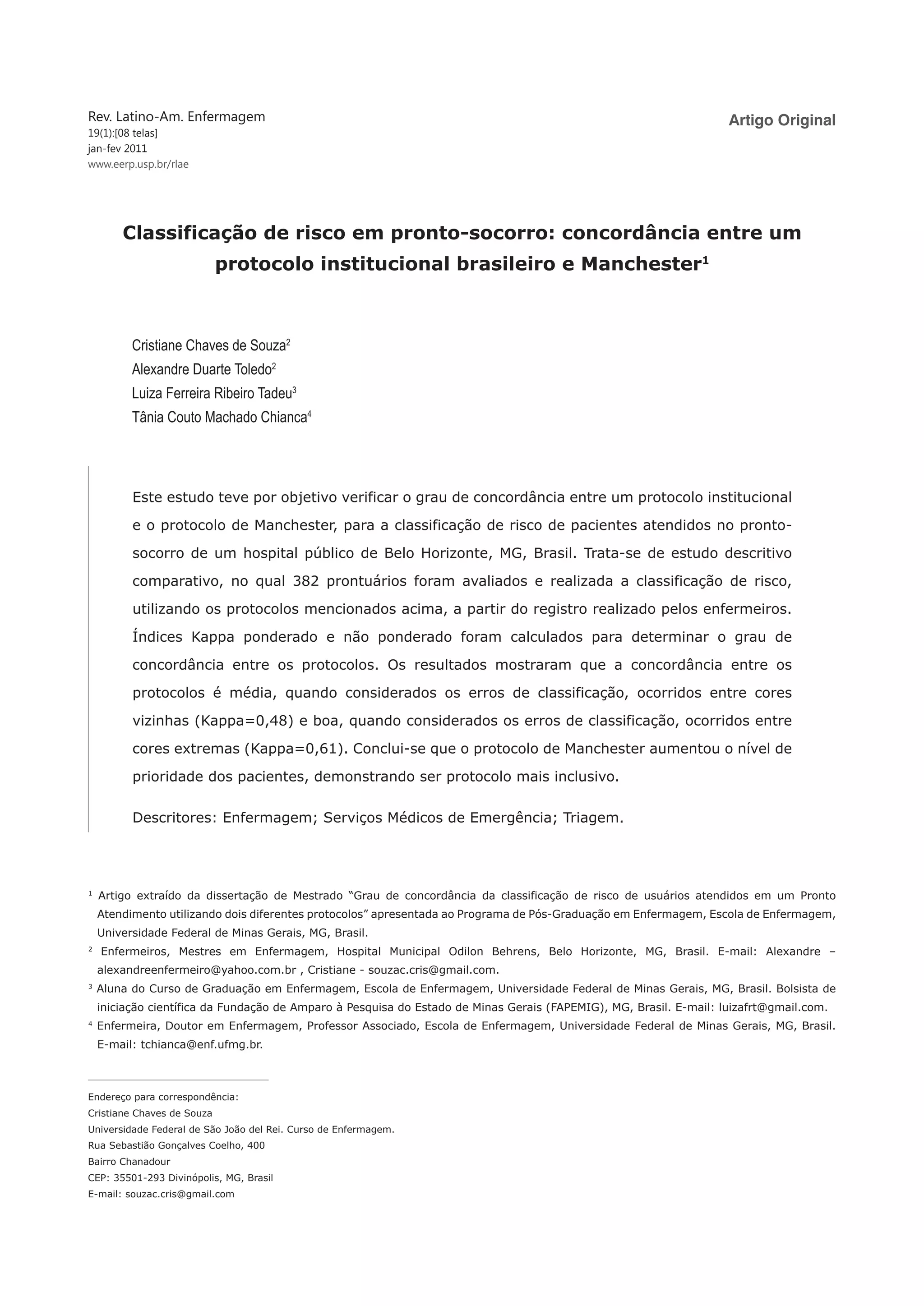 Este estudo comparou a classificação de risco de pacientes em um pronto-socorro usando dois protocolos diferentes: o protocolo institucional do hospital (HOB) e o protocolo de Manchester. Ao avaliar 382 prontuários usando ambos os protocolos, encontrou-se uma concordância média quando erros ocorreram entre cores vizinhas (Kappa=0,48), e boa concordância quando erros ocorreram entre cores extremas (Kappa=0,61). O protocolo de Manchester pareceu ser mais inclusivo, classificando pacientes com maior prioridade.