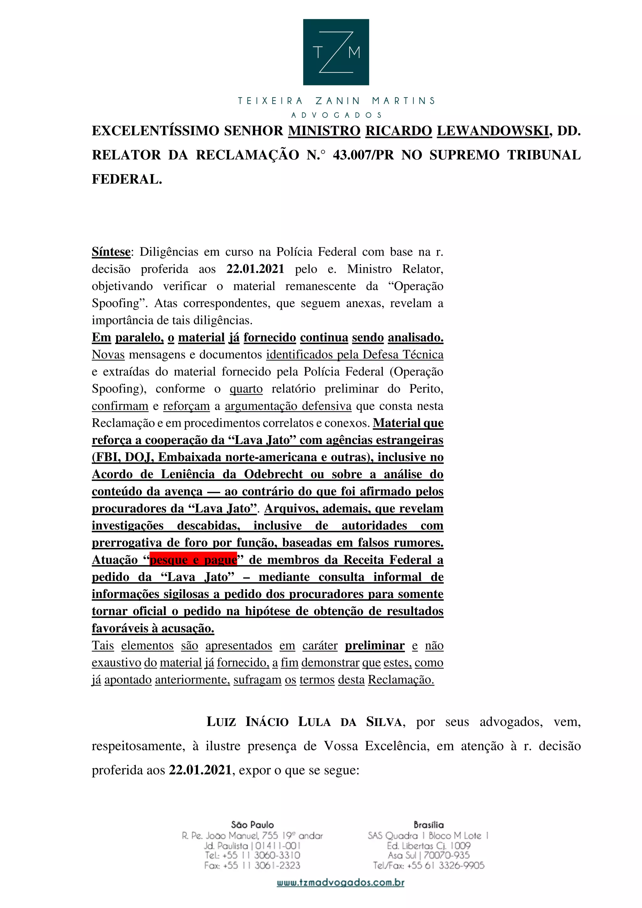 O documento relata que a defesa técnica do reclamante Lula continua realizando diligências para acessar material remanescente da Operação Spoofing e que novas mensagens e documentos identificados reforçam as alegações da defesa sobre ilegalidades da Lava Jato, incluindo cooperação indevida com agências estrangeiras e investigações descabidas de autoridades. Além disso, mensagens revelam orientações do ex-juiz Sergio Moro ao MPF e controle indevido sobre acordos de delação.
