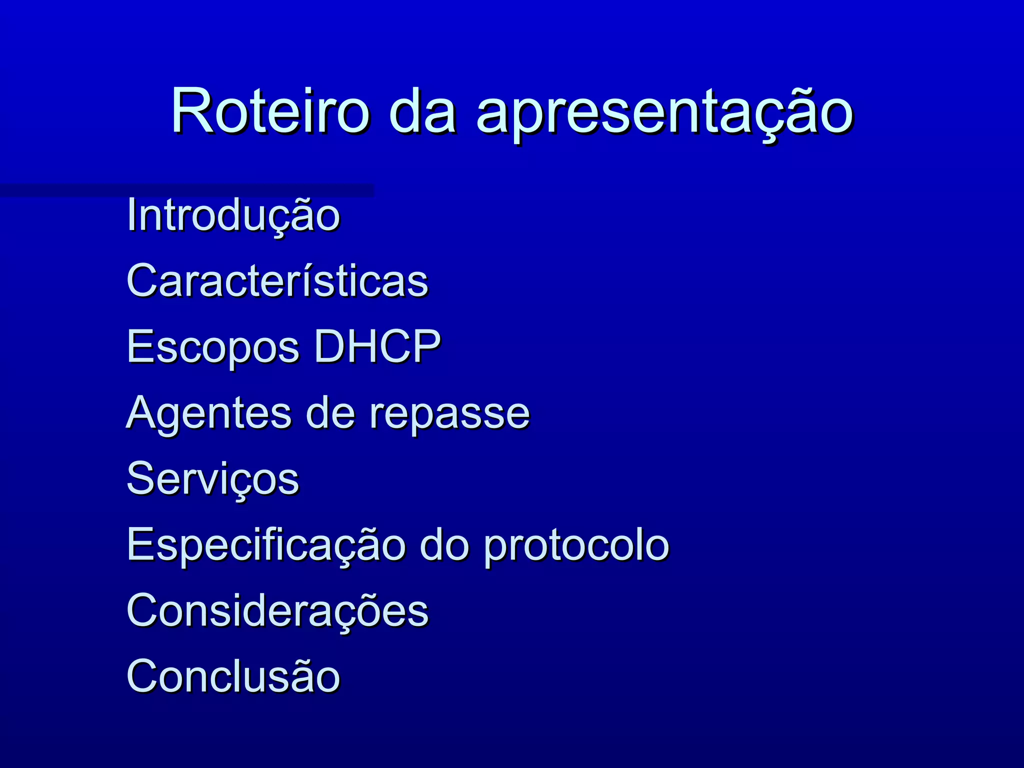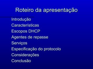O documento descreve o protocolo DHCP, incluindo suas características como alocação dinâmica e automática de endereços IP para clientes, o uso de agentes de repasse para expandir a cobertura do servidor DHCP, e os tipos de mensagens trocadas entre cliente e servidor como DHCPDISCOVER e DHCPOFFER.