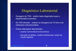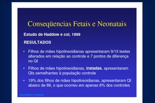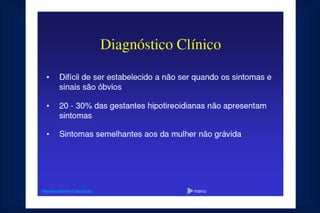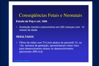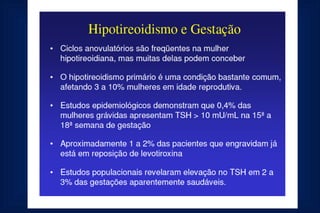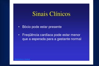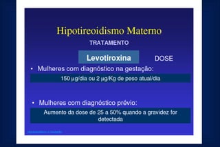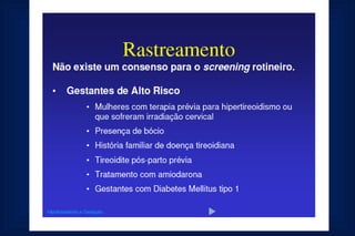 Este documento fornece uma rotina de solicitação de exames laboratoriais para avaliação da função tiroidiana durante a gestação. Ele lista os exames que devem ser realizados na primeira consulta, no segundo e terceiro trimestres, incluindo testes de TSH, T4 livre, anticorpos anti-TPO e ecografia obstétrica para monitorar qualquer hipotiroidismo durante a gravidez.