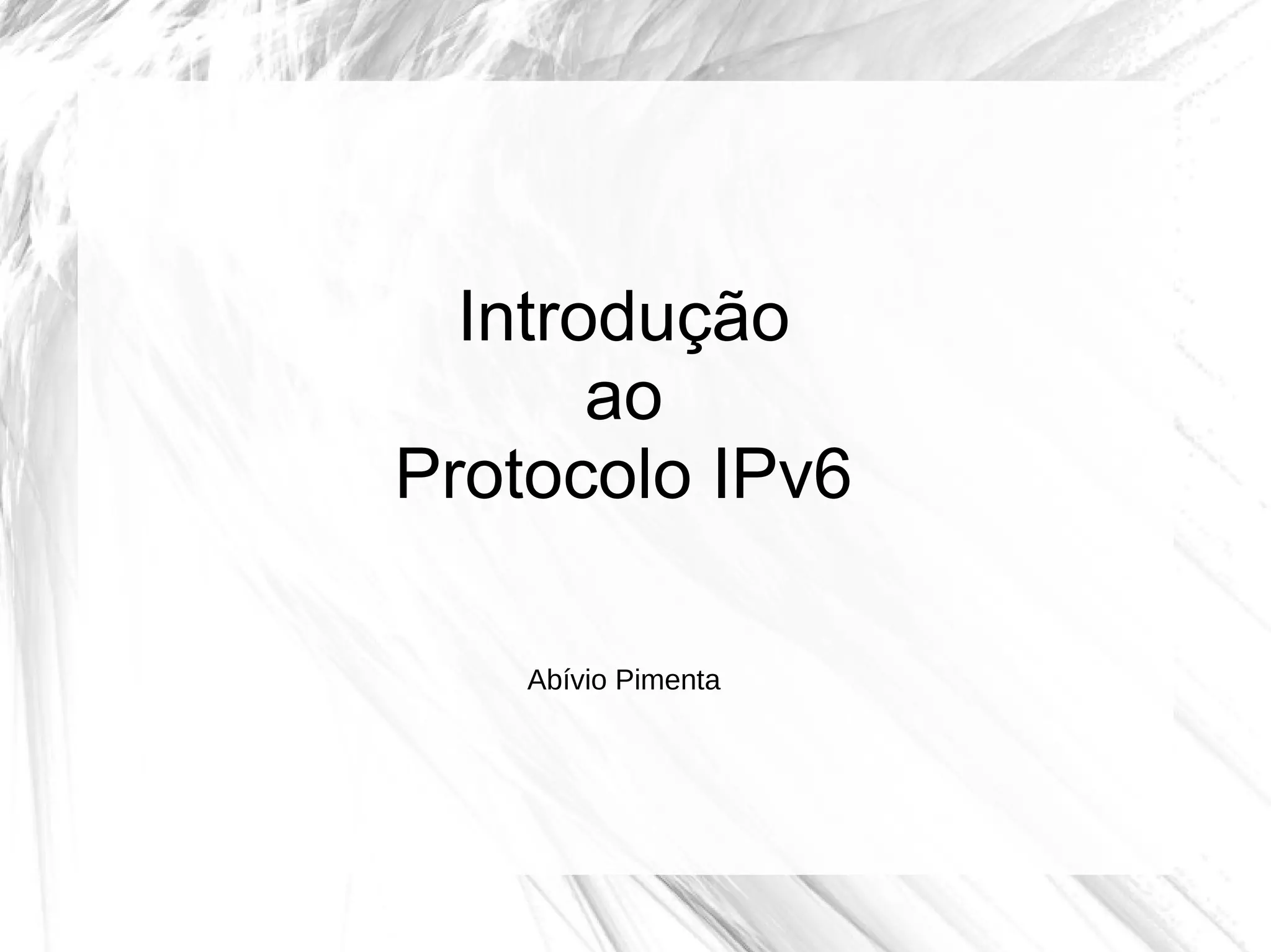 O documento introduz o protocolo IPv6, discutindo suas motivações e características principais, como o grande número de endereços disponíveis, suporte nativo a segurança e qualidade de serviço, e a extinção de protocolos como NAT e ARP. Também aborda tópicos como migração, obstáculos, e a necessidade de adoção para evitar riscos como aumento de custos e perda de competitividade.