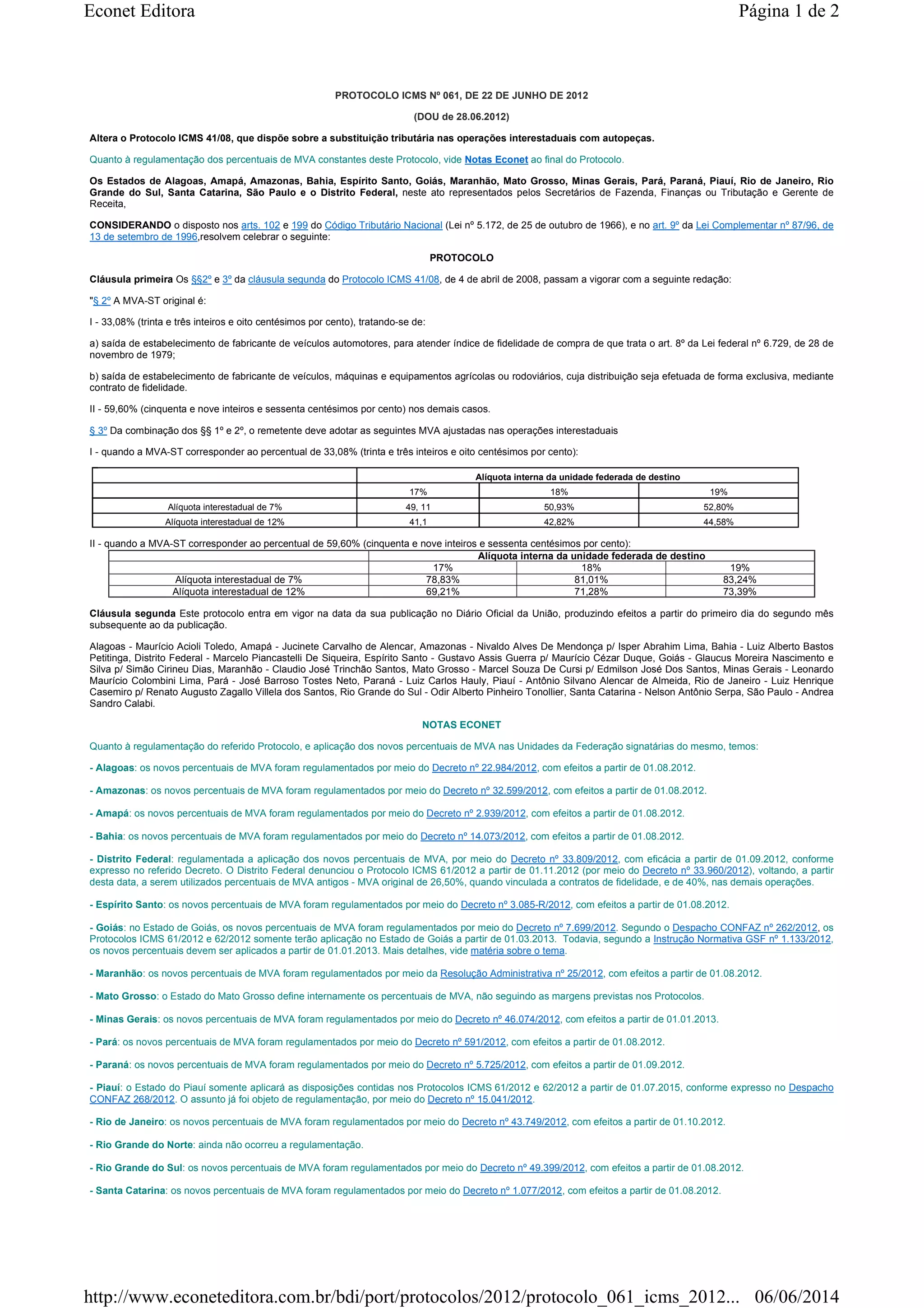 O documento altera o Protocolo ICMS 41/08 sobre substituição tributária nas operações interestaduais com autopeças, estabelecendo novos percentuais de MVA. Os estados signatários regulamentaram a aplicação dos novos percentuais em decretos com efeitos a partir de agosto de 2012, exceto Minas Gerais que o fez em janeiro de 2013.