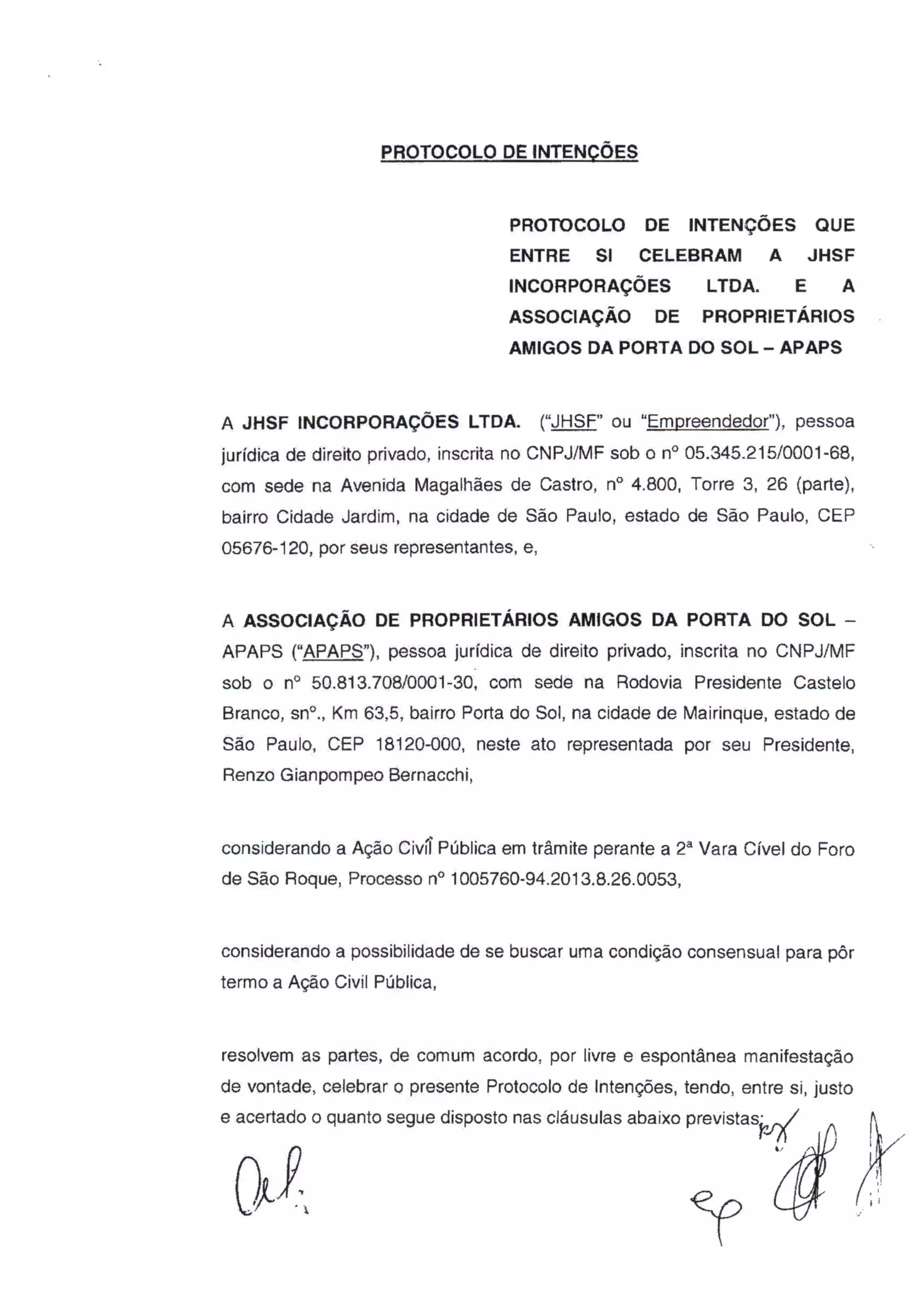 Protocolo JHSF APAPS para que a APAPS suspenda a ação contra a instalação do aeroporto
