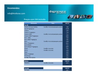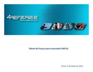 Este documento apresenta uma tabela de preços para associados da NAFLIS com produtos e serviços da empresa 4 Referee, incluindo preços com IVA, condições como entregas grátis no Porto e compra mínima de 50€, e contactos como número de telefone e emails.