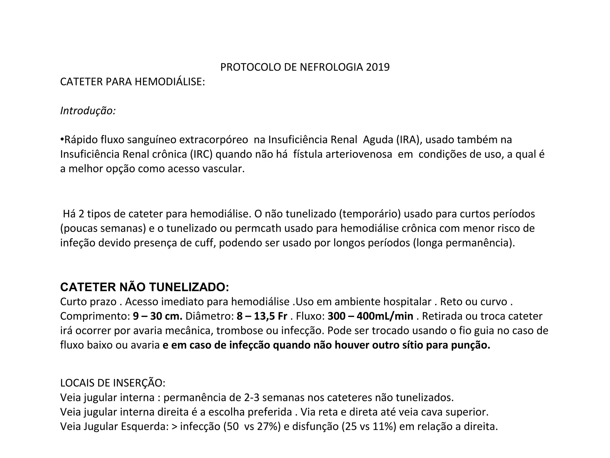 O documento descreve os tipos de cateteres para hemodiálise, como não tunelizados e tunelizados, e seus usos. Detalha locais de inserção, manutenção, complicações e infecções relacionadas a cateteres, além de protocolos de tratamento para infecções. Também aborda complicações comuns na hemodiálise e suas terapias.