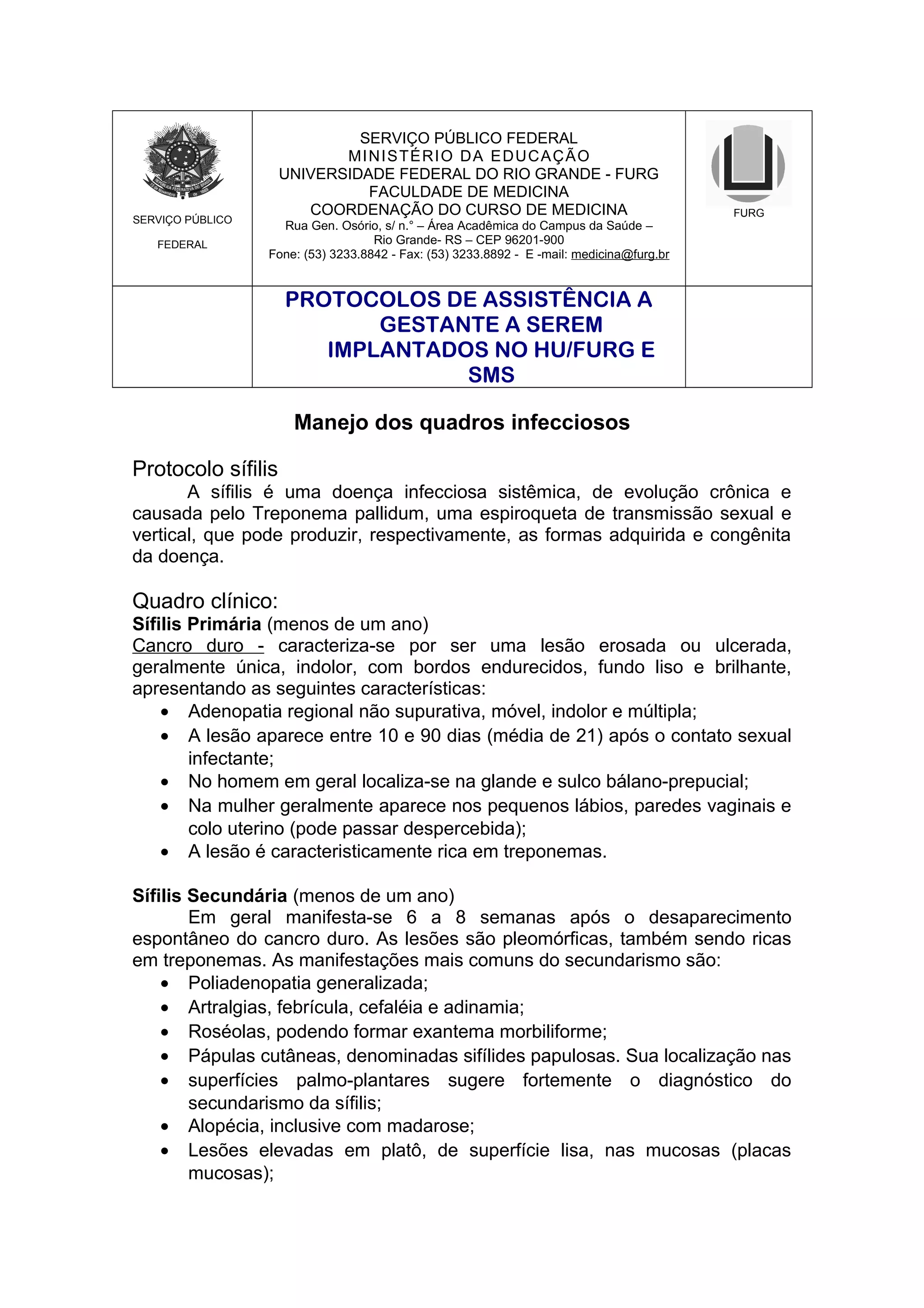 1) O documento descreve protocolos para o tratamento da sífilis em gestantes, incluindo estágios clínicos da doença, diagnóstico pré-natal, tratamento com penicilina e orientações.