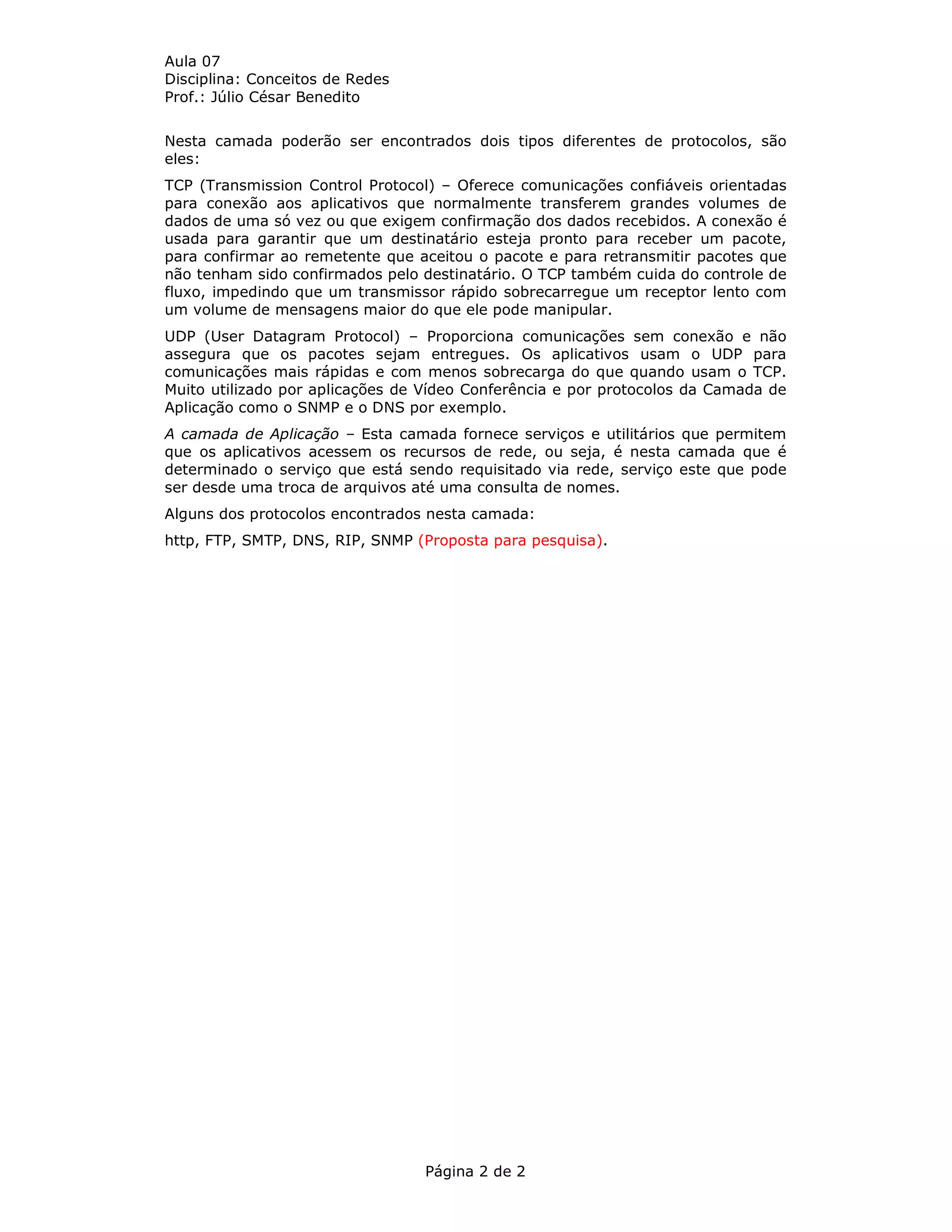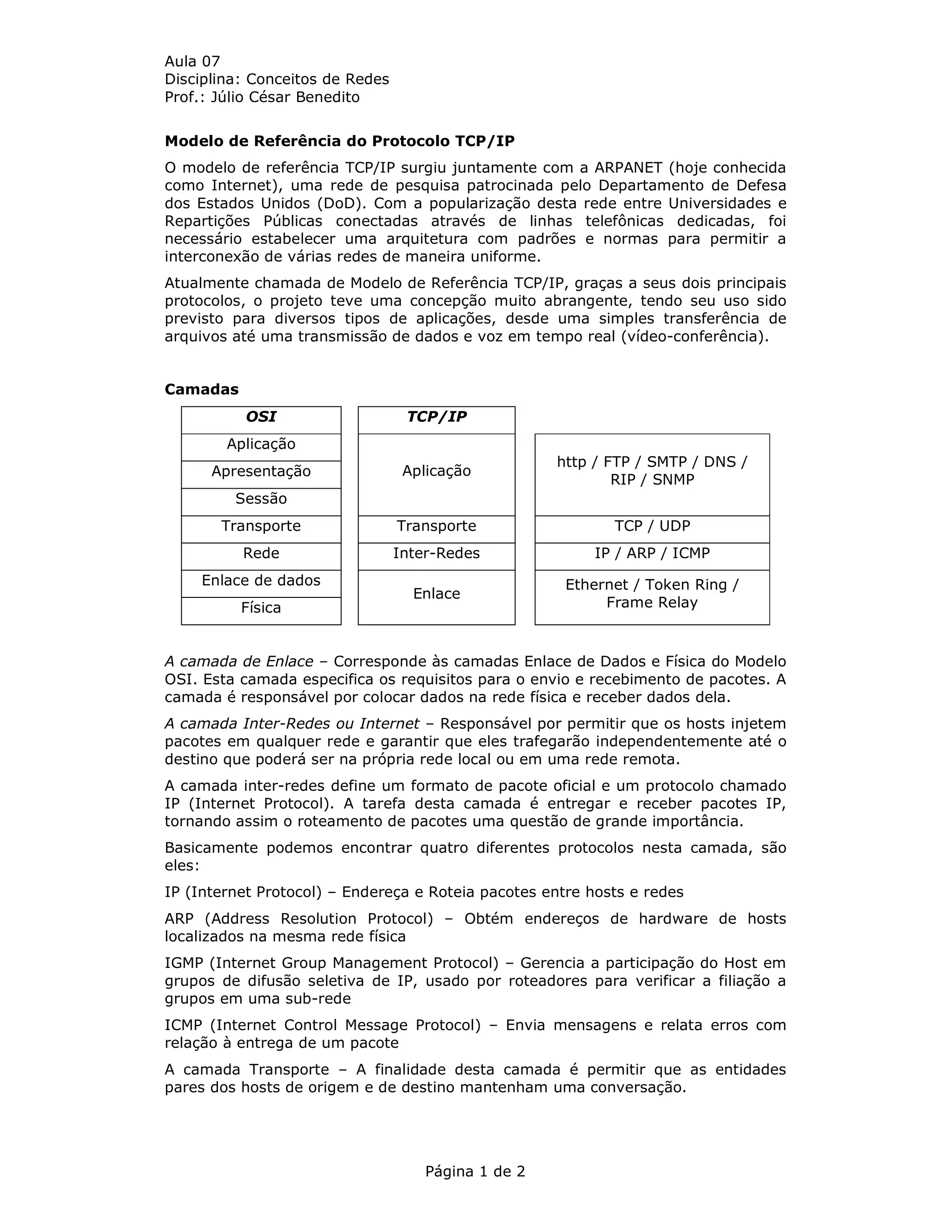 O documento descreve o modelo de referência TCP/IP, incluindo suas camadas e principais protocolos. As camadas são: Enlace, Inter-Redes, Transporte e Aplicação. Os protocolos mais importantes são IP, TCP e UDP, que operam nas camadas Inter-Redes e Transporte para roteamento e transmissão confiável/não confiável de dados entre hosts.