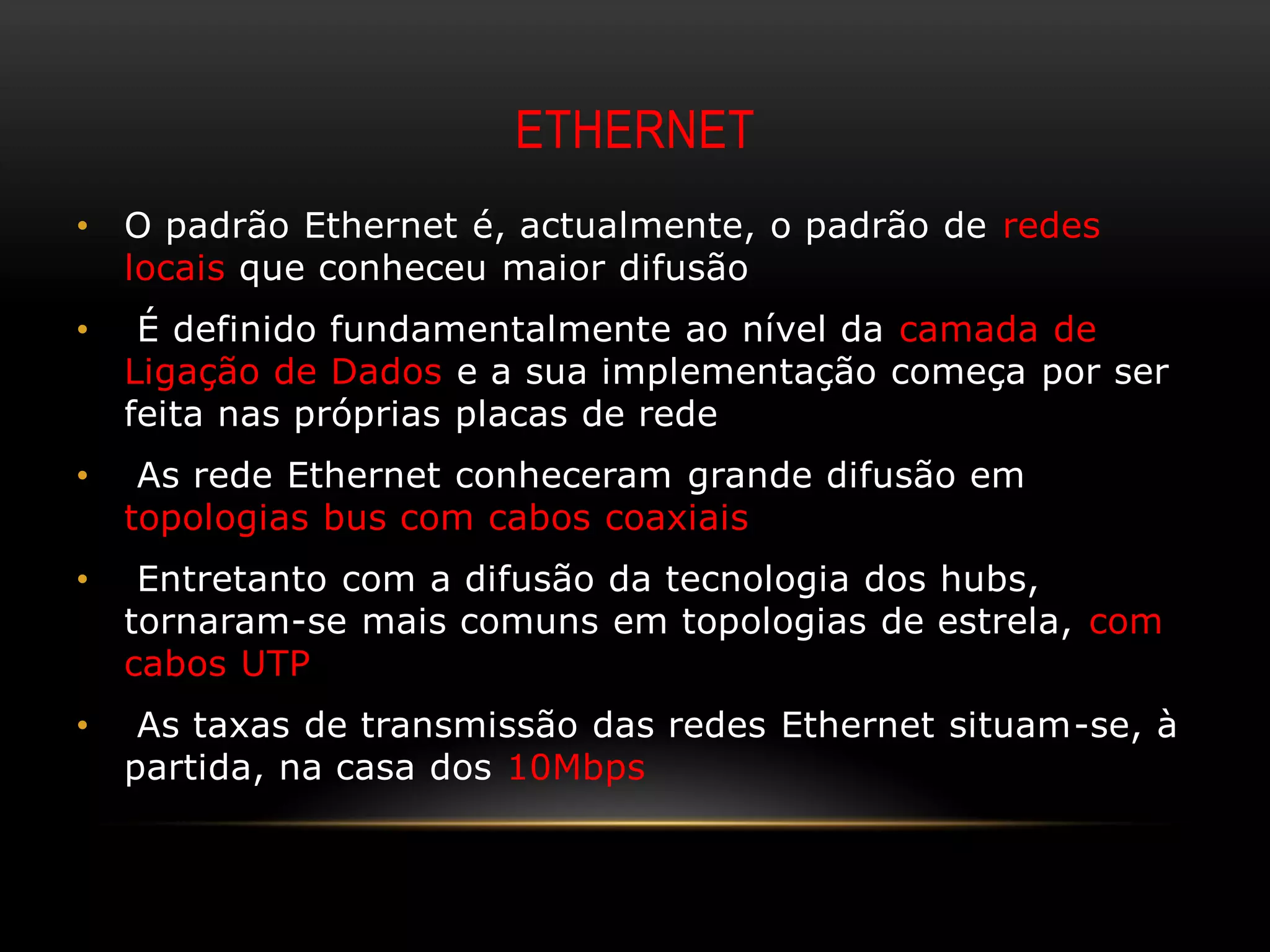 O documento descreve os padrões Ethernet e Token-Ring para redes locais. Ethernet utiliza o método CSMA/CD em topologias de bus ou estrela, enquanto Token-Ring usa um token que circula em uma topologia de anel lógico para permitir o acesso ao meio e evitar colisões.