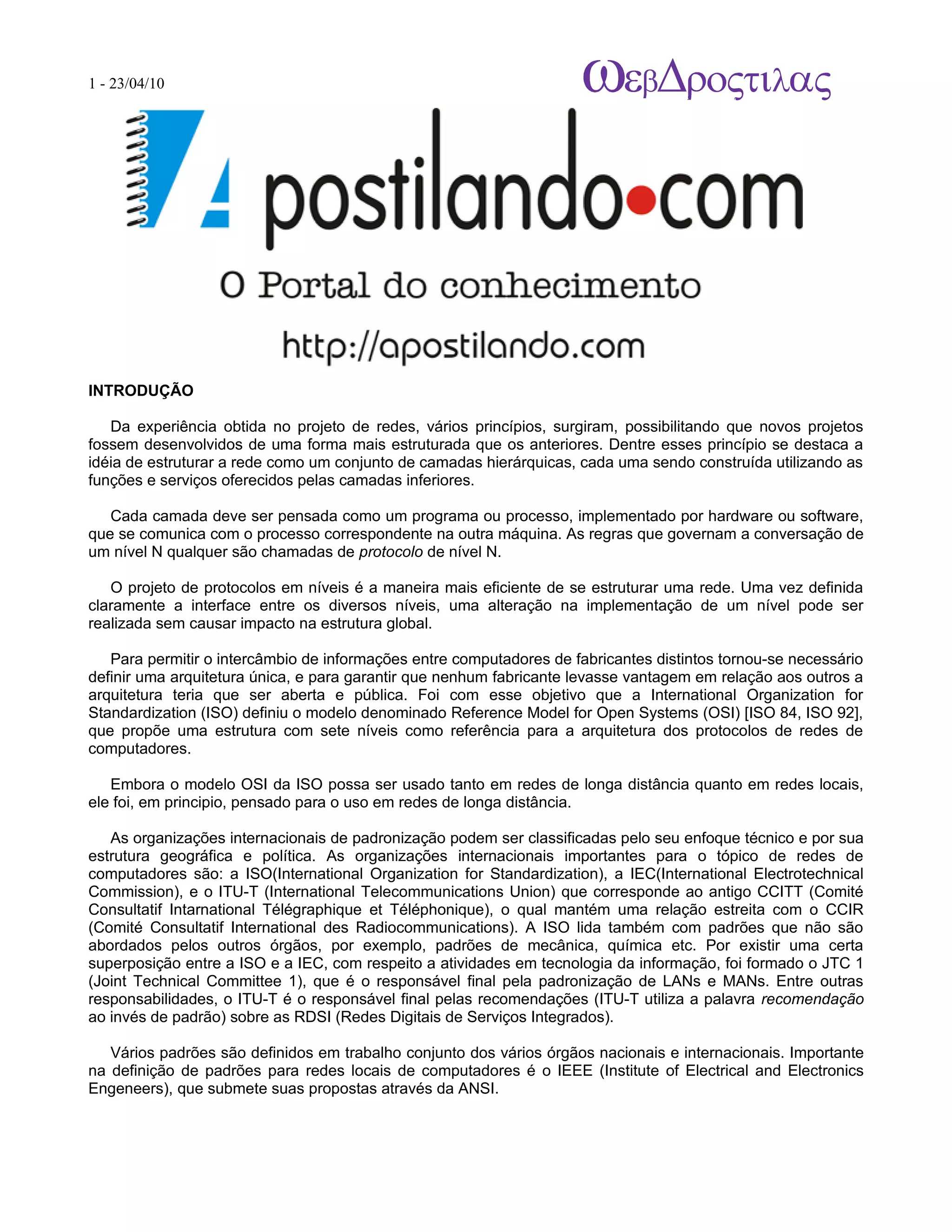 O documento discute os principais protocolos e padrões para redes de computadores, incluindo o modelo OSI de 7 camadas da ISO, protocolos como X.25, SDLC, HDLC e Ethernet. Também aborda organizações de padronização como ISO, IEC, IEEE e CCITT e suas recomendações para redes públicas e privadas.