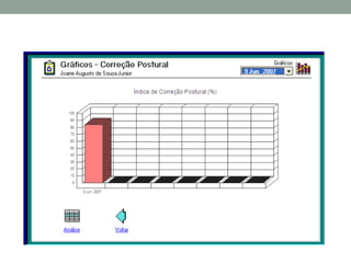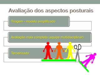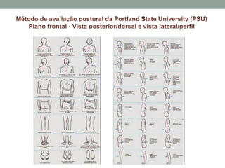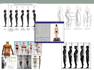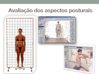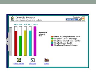 O documento discute medidas e avaliação postural em educação física, propondo protocolos de análise subjetiva que identificam desvios e assimetrias nos segmentos corporais. É apresentado o Índice de Compensação Postural (ICP), calculado a partir de notas atribuídas às regiões do corpo, para triagem e possível encaminhamento a equipe multidisciplinar. Valores baixos de ICP indicam maior comprometimento postural.