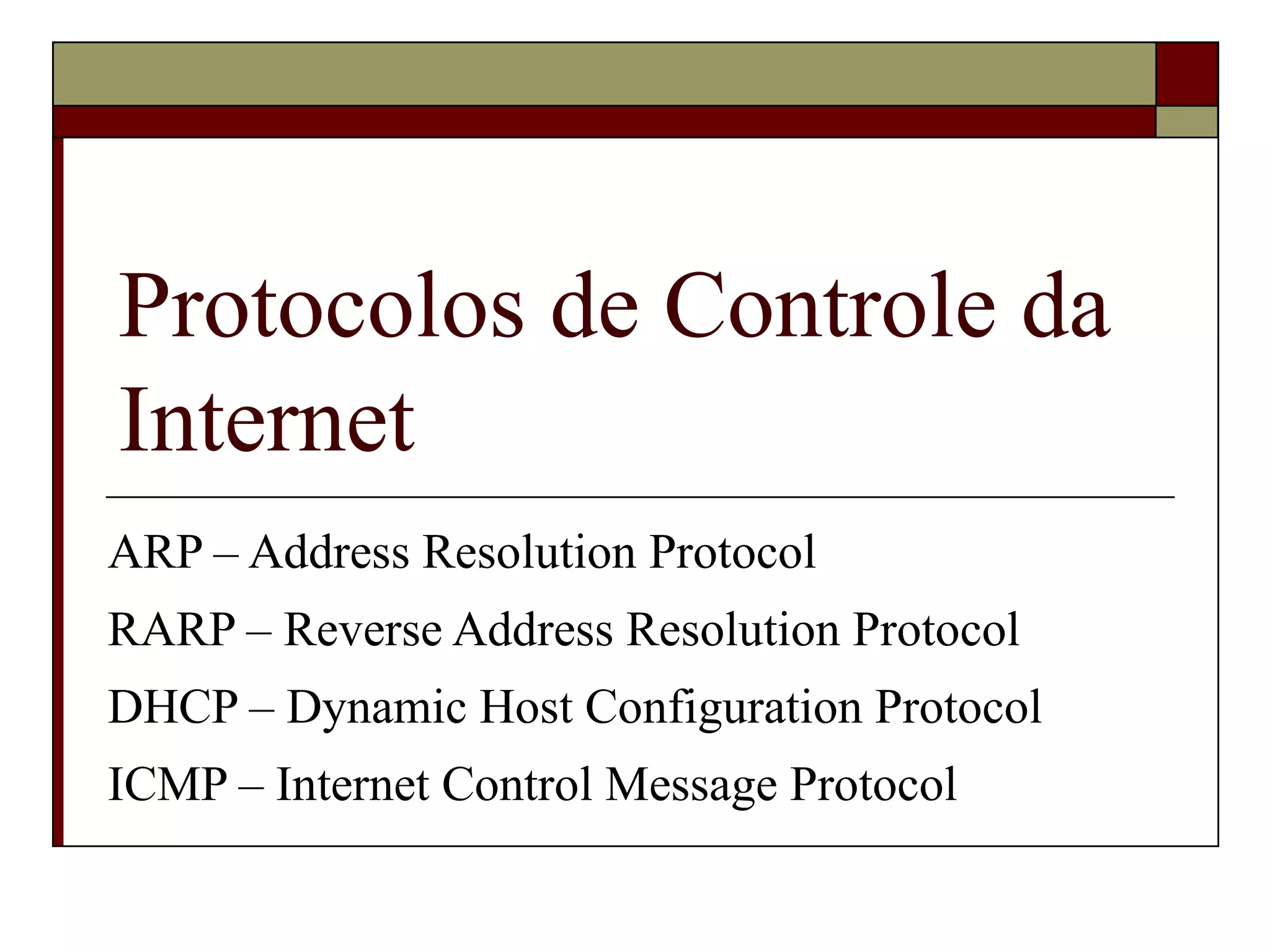 O documento descreve quatro protocolos fundamentais da Internet: ARP, que mapeia endereços IP para endereços MAC; RARP, que faz o inverso de ARP; DHCP, que atribui endereços IP dinamicamente; e ICMP, que transmite mensagens de controle e erro entre dispositivos da rede.