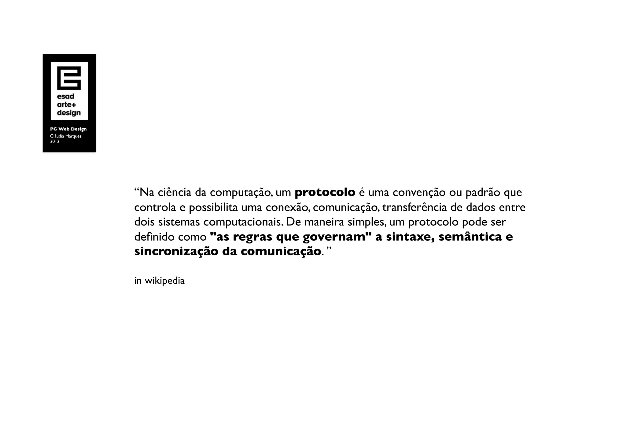O documento discute os principais protocolos da Web, incluindo TCP/IP para transporte de dados, HTTP para envio de páginas Web, HTTPS para segurança, FTP para transferência de arquivos e SMTP/POP/IMAP para e-mail. Explica brevemente o que cada um faz.