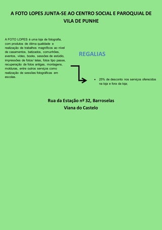 O documento apresenta várias empresas que se juntam ao Centro Social e Paroquial de Vila de Punhe, fornecendo descontos e serviços gratuitos ou a preços reduzidos nas suas áreas, como saúde, fotografia, desporto, ótica e seguros.