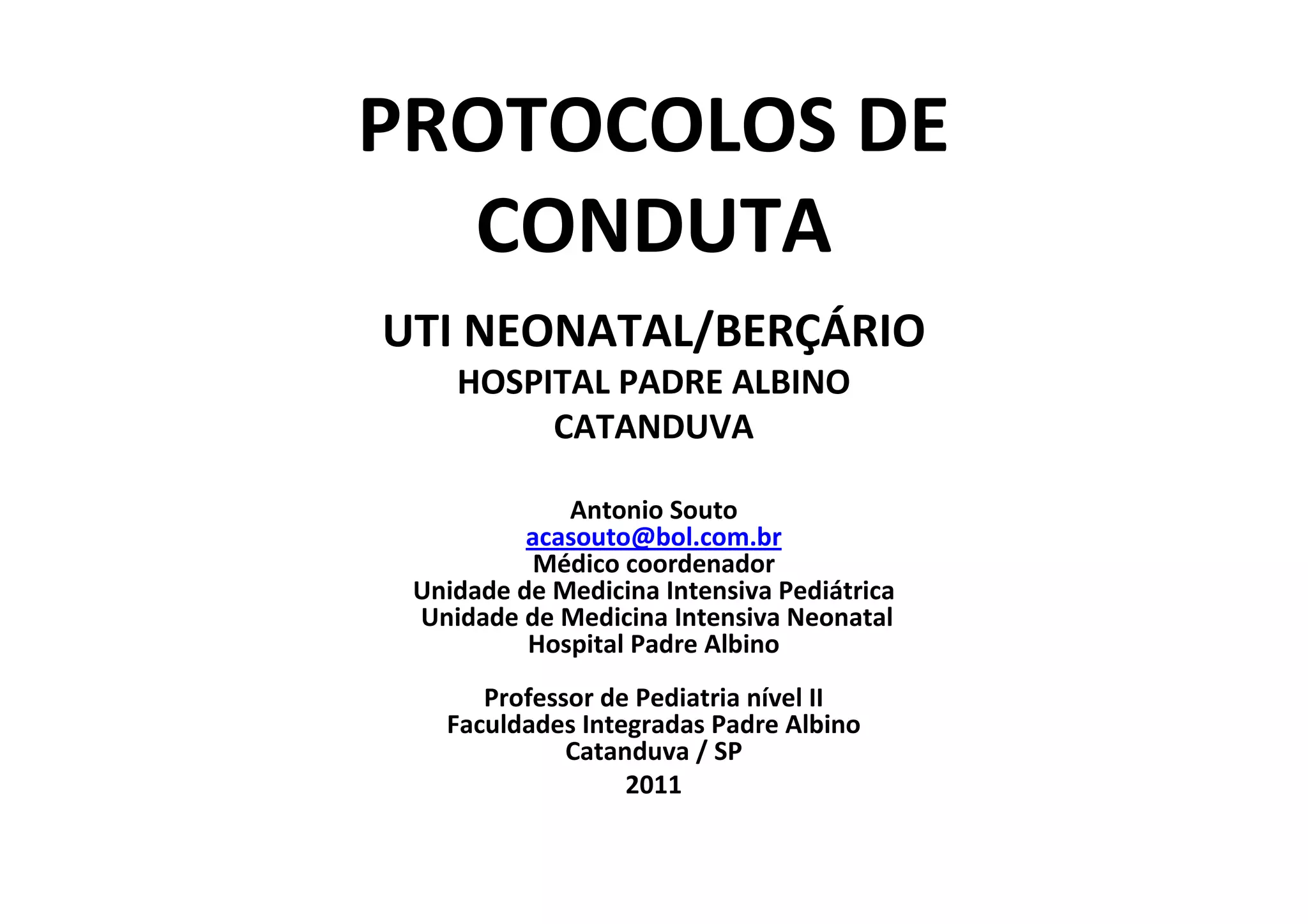Este documento fornece protocolos de conduta para a UTI Neonatal/Berçário do Hospital Padre Albino em Catanduva, incluindo diretrizes sobre suporte hidroeletrolítico, nutricional, ventilatório e prevenção de infecção neonatal.