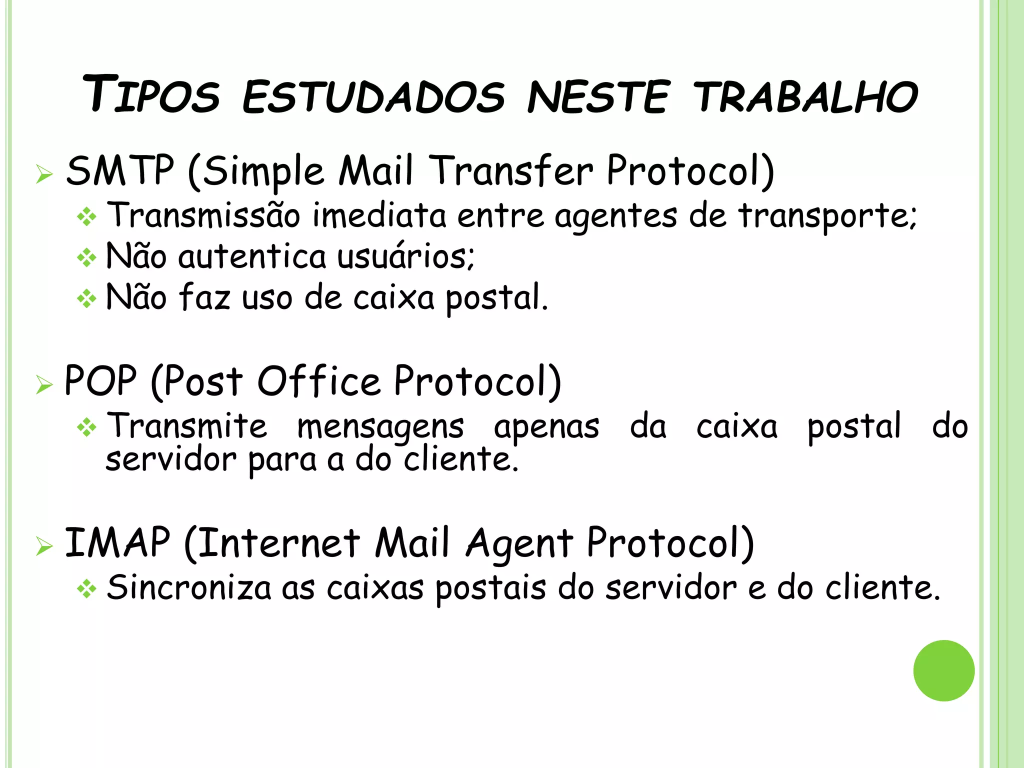 O documento discute três protocolos de e-mail: SMTP, POP e IMAP. O SMTP é utilizado para a transmissão de mensagens, enquanto o POP permite o download das mensagens da caixa postal do servidor para o cliente, e o IMAP oferece funcionalidades avançadas para manipular mensagens no servidor. Cada protocolo opera em portas específicas e permite diferentes formas de acesso e gerenciamento de correio eletrônico.