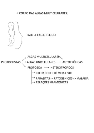 O reino Protista inclui eucariontes unicelulares que se alimentam de forma heterotrófica ou autotrófica. Apresentam reprodução sexuada ou assexuada e incluem protozoários parasitas que causam doenças como a malária, bem como algas multicelulares com corpos formados por falsos tecidos.
