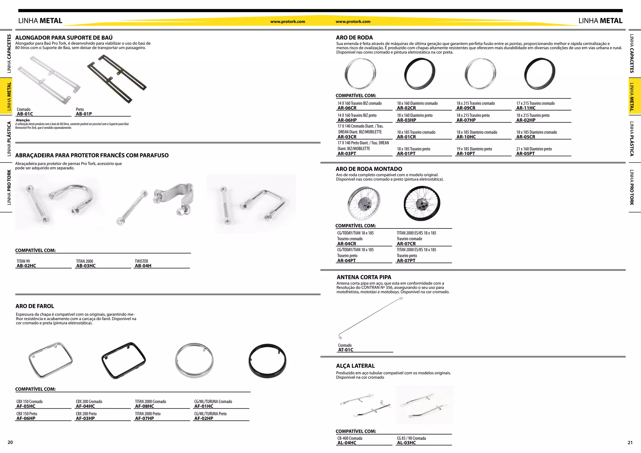 O documento lista diversos acessórios e peças para motocicletas da marca Pro Tork, incluindo alongadores para baús, aros de rodas, alças laterais e traseiras, bagageiros, antenas e abraçadeiras. As peças são descritas brevemente e indicam os modelos de motos para os quais são compatíveis.