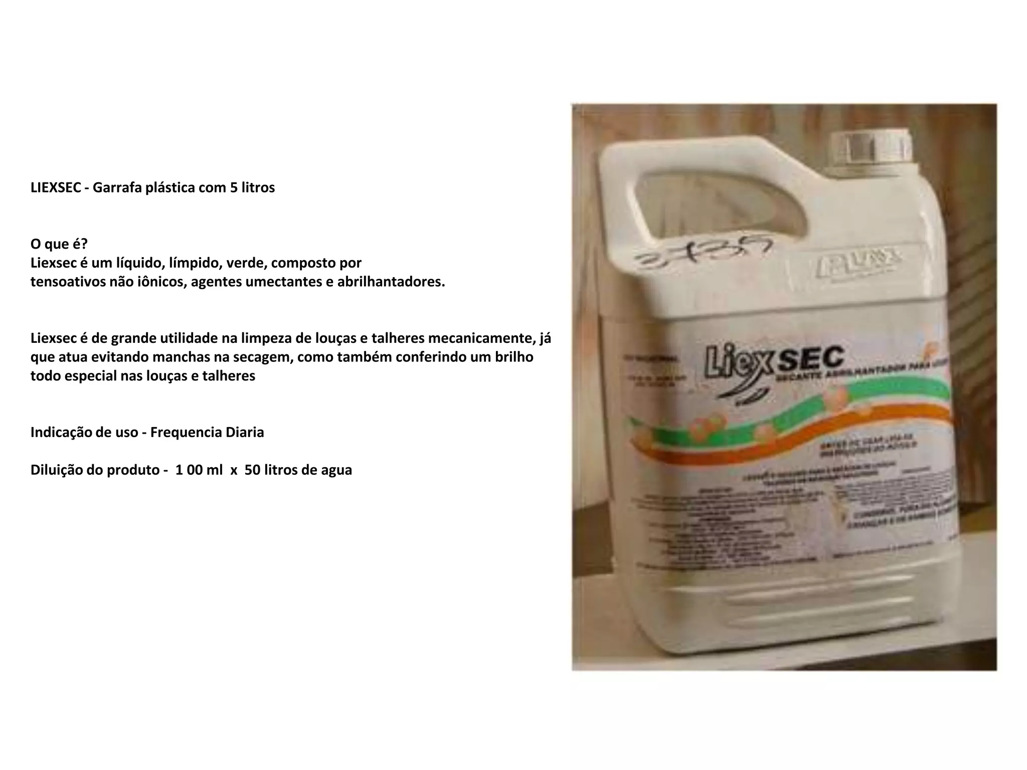 Liexsec é um líquido verde composto por tensoativos e agentes umectantes que ajuda a limpar louças e talheres mecanicamente, evitando manchas e conferindo brilho. Deve ser diluído em 100ml para cada 50 litros de água e usado diariamente para limpeza.