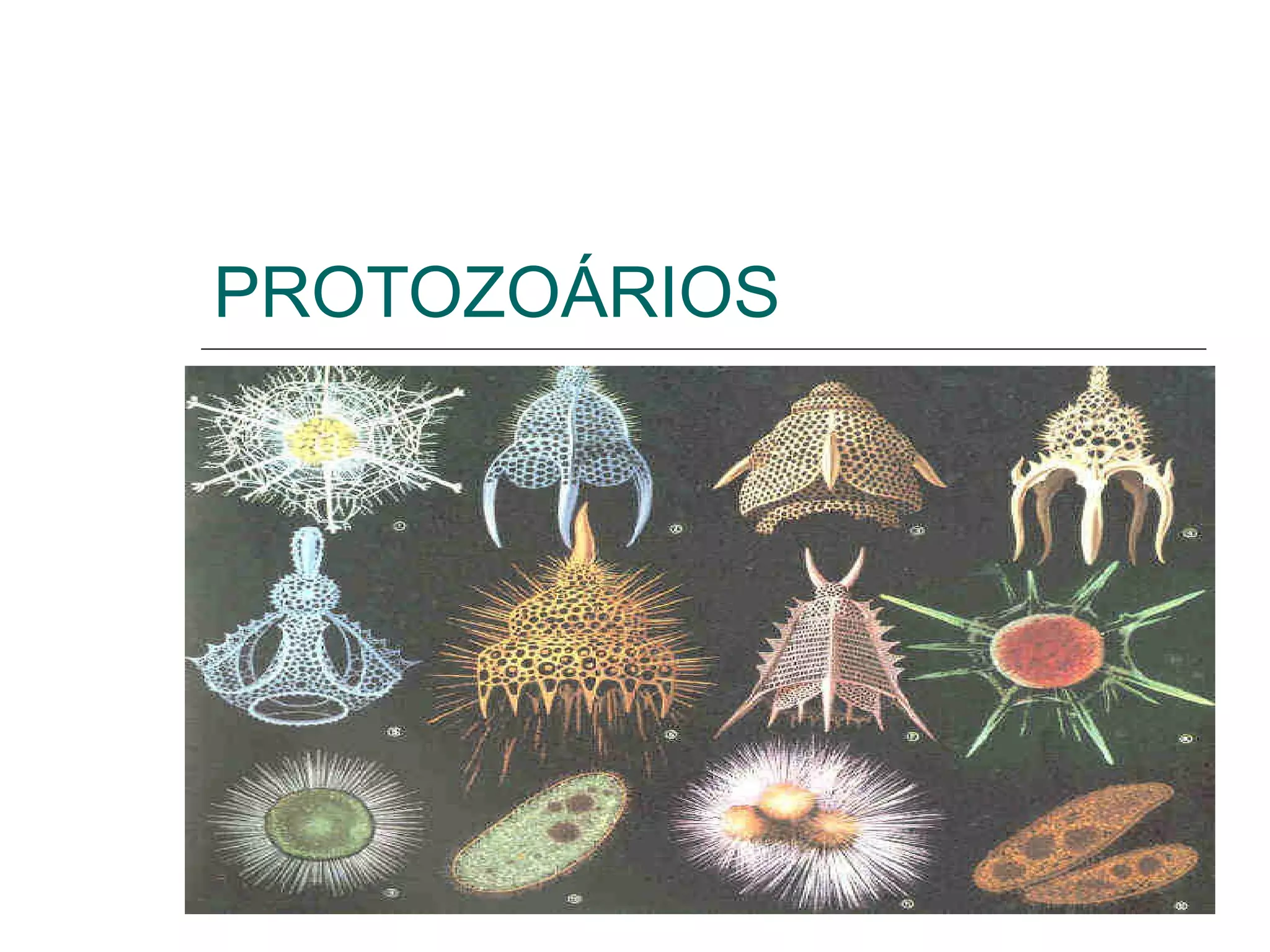 Este documento descreve os principais tipos de protozoários, incluindo suas características, ciclo de vida, reprodução e alguns parasitas que causam doenças humanas. Detalha os protozoários como Entamoeba histolytica, causador da amebíase; Trypanosoma cruzi, causador da doença de Chagas; e Plasmodium vivax, causador da malária. Fornece informações sobre como esses parasitas são transmitidos e medidas para preveni-los.