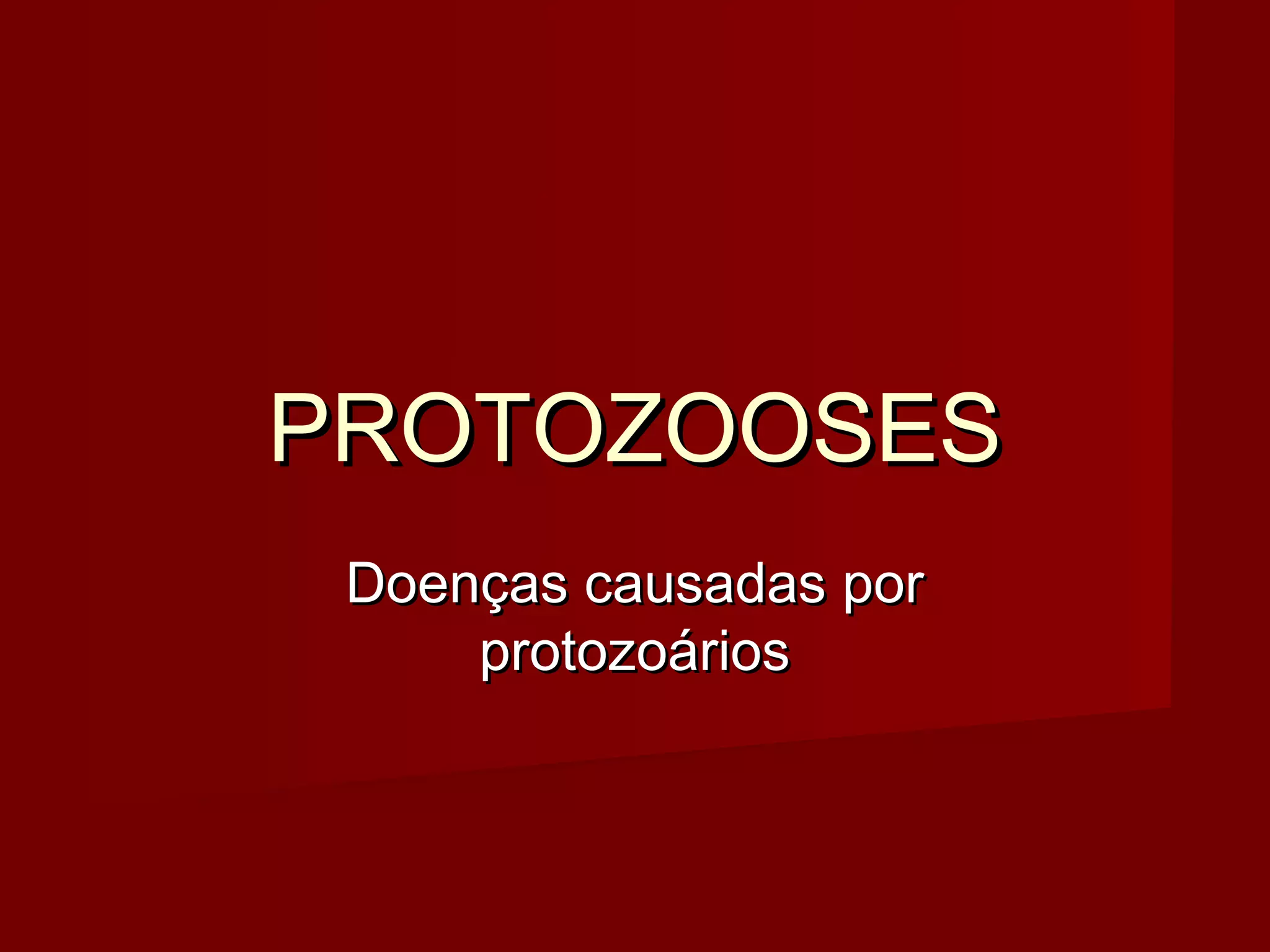 O documento descreve várias protozooses, doenças causadas por protozoários, incluindo amebíase, doença de Chagas, malária, úlcera de Bauru e toxoplasmose. Ele fornece detalhes sobre os agentes causadores, ciclos de vida, sintomas e formas de transmissão e prevenção dessas doenças.