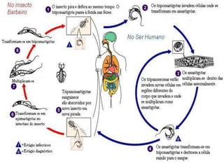 O documento descreve diferentes protozoários, incluindo suas características, ciclos de vida e doenças causadas. É feita uma classificação dos protozoários de acordo com sua locomoção e são descritas em detalhe as amebíases, doença de Chagas, leishmaniose e malária.