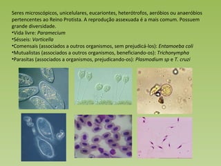 O documento descreve diversos protozoários, classificando-os de acordo com seu modo de vida e locomoção. Detalha doenças causadas por protozoários parasitas, descrevendo o agente causador, vetor, hospedeiro, sintomas e medidas de prevenção para doenças como a de Chagas, amebíase, leishmaniose e malária.